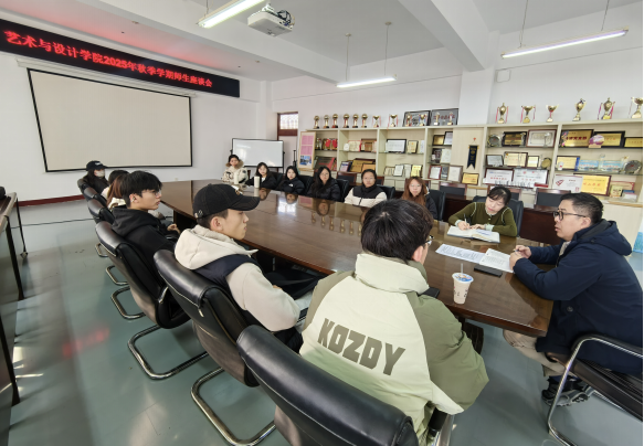 2025年秋季学期学生座谈会。学院副院长刘维尚、综合办公室宋立巍老师出席,辅导员卢文龙主持,23级本科视觉传达专业文化创意产业1班全体同学参加。