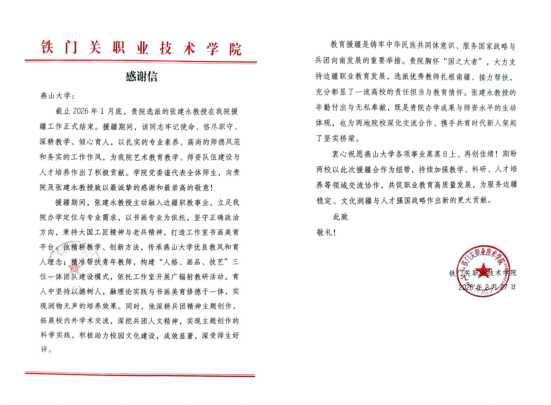 张建永教授援疆工作圆满结束,铁门关职业技术学院发来感谢信,向我校及张建永教授致以诚挚感谢与崇高敬意,高度肯定其援疆贡献。