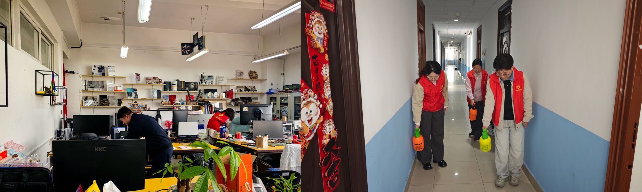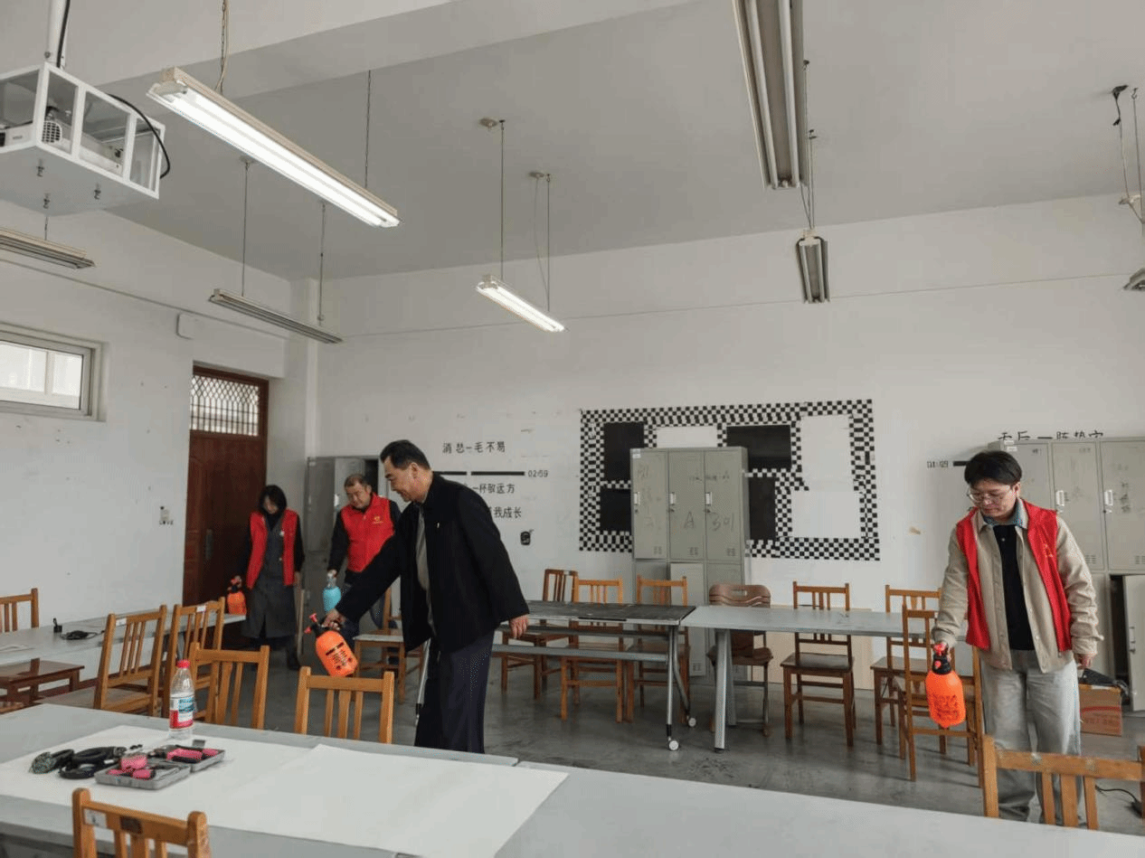 于2026年4月正式启动第一期“守护健康”消毒行动。学院分工会成立“艺心为你”职工志愿服务队,由学院领导、机关工作人员及辅导员共同参与,对专业教室、工作室、办公室及学生宿舍进行全面规范消杀,全力守护师生健康安全。