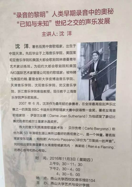 邀请著名男中音歌唱家沈洋老师在音乐馆104举行大师公开课。