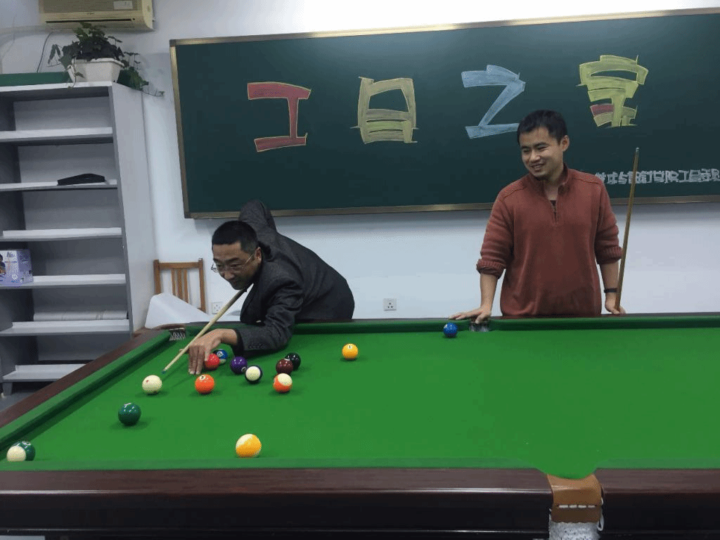 在美术馆B311举办台球比赛。本次赛事现场以抽签形式分组,采取单淘汰赛制,经过初赛、复赛、决赛,最终董梁飞老师摘得台球比赛桂冠,栗功老师屈居亚军。比赛场面紧张激烈,前来参加角逐的台球爱好者,以精湛地技艺演绎了一场场精彩绝伦的比赛。选手们在比赛过程中都认真计算着球的走位,思考着挥杆的力度与角度,精准的球技引来现场观众的阵阵喝彩。