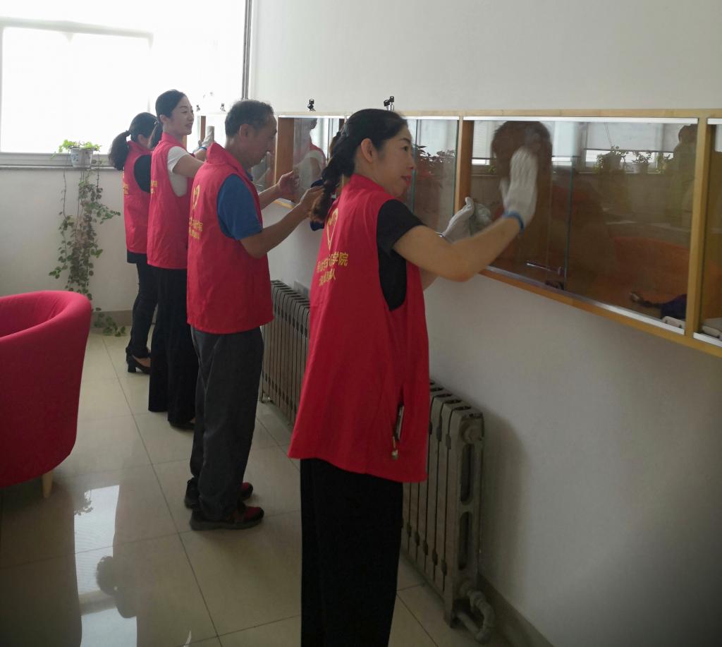 党员们首先对三楼办公区域以及工作室门前的窗台、门框等进行了细致清洗。大家热情高扬,配合默契,清扫工作开展的有条不紊,最终整个办公区域的面貌焕然一新。