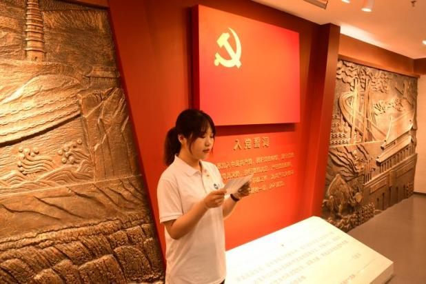 本科生第三党支部新党员、党员组织生活馆讲解员时歌带领新党员们参观国产无码