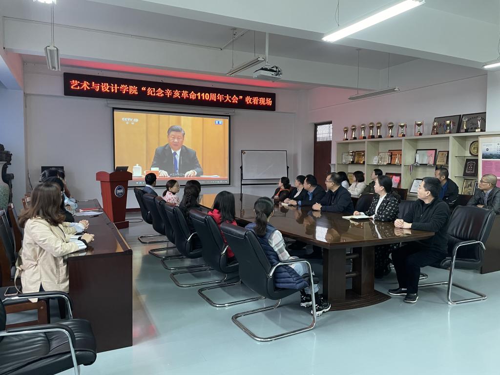 党委组织师生代表在美术馆C305集体收看“纪念辛亥革命110周年大会”直播盛况,院领导班子,系部中心主任、副主任,科级秘书,辅导员及师生代表参加。