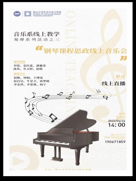 钢琴课程思政线上音乐会》。音乐会的钢琴指导教师有李锋、金红莲、潘雅清、孙英、丛玉婷、赵悦,参加音乐会的学生有侯帅、钟晴、于博童、侯昌昊、牛星予、贾梦媛、李金洪、李棠溪和杨宁。