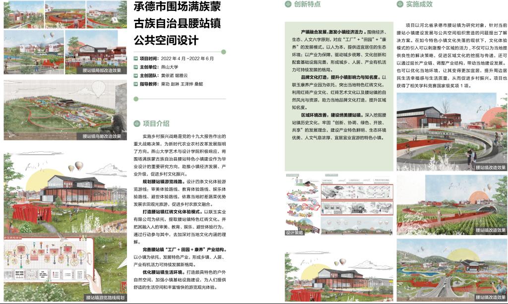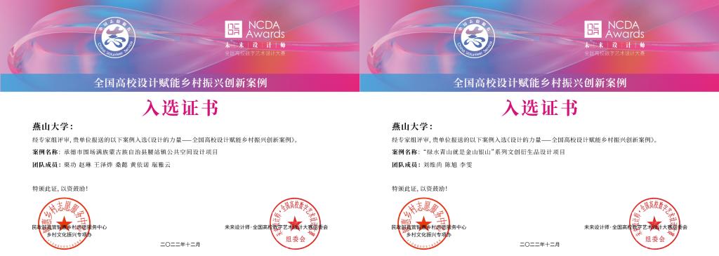 12月10日,中共中央宣传部“学习强国”学习平台以《【菁菁教苑】我为乡村做设计,高校师生在行动》为题,报道了未来设计师·全国高校数字艺术设计大赛(NCDA)组委会与民政部直管智惠乡村志愿服务中心联合发起“我为乡村做设计”志愿服务活动。我校被授予“全国高校设计赋能乡村振兴志愿服务先进单位”荣誉称号,同时我校设计赋能乡村振兴创新案例《承德市围场满族蒙古族自治县腰站镇公共空间设计项目》和《“绿水青山就是金山银山”系列文创衍生品设计项目》入选设计的力量—全国高校设计赋能乡村振兴创新案例。该荣誉是对我校积极开展设计赋能区域社会发展,投身美丽河北乡村振兴志愿服务方面取得成果的肯定,同时也激励老师同学们继续以“设计为人民服务”结合专业积极开展乡村振兴的设计创作,为建设美丽河北贡献燕大力量,助力学校双一流建设。