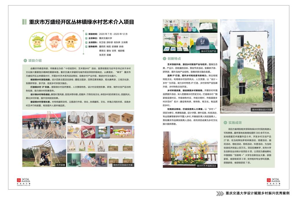 为贯彻落实“乡村振兴”战略,发挥学科竞赛“立德树人”功能,推动高校设计创新力量赋能乡村振兴,未来设计师·全国高校数字艺术设计大赛(NCDA)组委会与民政部直管智惠乡村志愿服务中心联合发起“我为乡村做设计”志愿服务活动,开展包含乡村设计学学术研究、乡村振兴设计竞赛、设计赋能乡村振兴案例征集、乡村振兴领域志愿服务等一系列活动内容,引导高校师生弘扬传统美德,传承红色文化,宣传乡村文旅,助力乡村振兴。活动得到工信部人才交流中心等单位的指导和支持,高校师生们的积极参与。