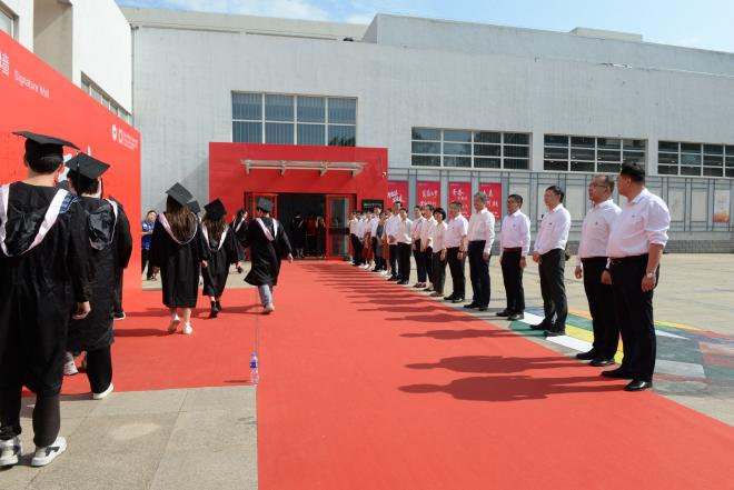 音乐厅正门,“无奋斗,不青春”签名墙,“为复兴设计,为人民抒怀”的响亮口号,一直延伸到音乐厅的红色地毯为毕业典礼营造出喜庆热烈的气氛。上午08:30, 学院班子成员、各系主任、教师代表、全体辅导员2023在音乐厅正门鼓掌迎接毕业生入场,2023届毕业生走红毯在签名墙前合影留念后步入会场。我们用艺术人特有的浪漫营造了庄重热烈的毕业气氛。