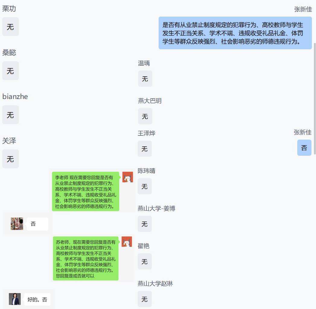 接着,温瑀组织全体教师围绕近年来教育部公开曝光的多起违反教师职业行为十项准则的典型案例,开展警示学习教育,并组织全体教师进行了充分细致的讨论。然后,系部全体教师就是否存在师德违规行为逐一进行确认,全体教师全部表示均不存在从业禁止制度规定的犯罪行为、与学生间的不正当关系、学术不端、违规收受礼品礼金、体罚学生等群众反映强烈、社会影响恶劣的师德违规行为。从业禁止制度规定的犯罪行为、高校教师与学生发生不正当关系、学术不端、违规收受礼品礼金、体罚学生等群众反映强烈、社会影响恶劣的师德违规行为。