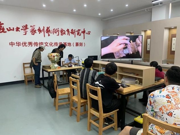 中华优秀传统文化传承基地(篆刻)教师与篆刻艺术微专业的同学、“篆刻进校园志愿者”群同学、学校的篆刻艺术爱好者共40余人参加课堂。