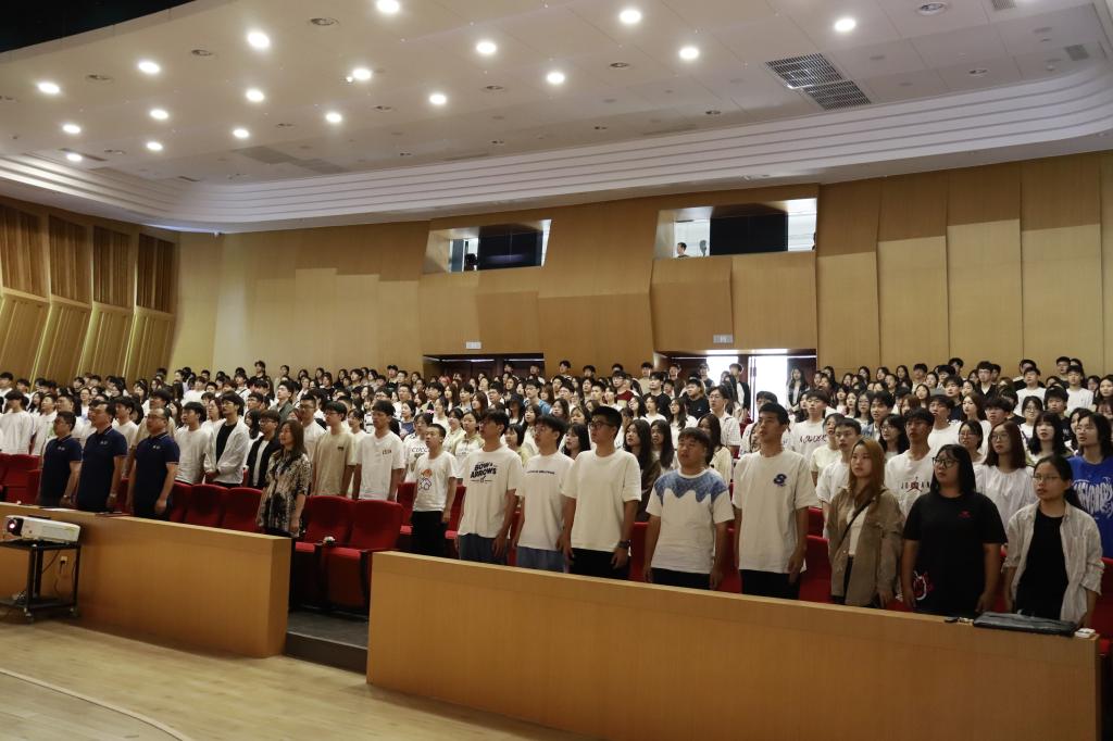 2023级新生开学典礼开始,到会领导、老师与同学们庄严站立,奏唱中华人民共和国国歌。