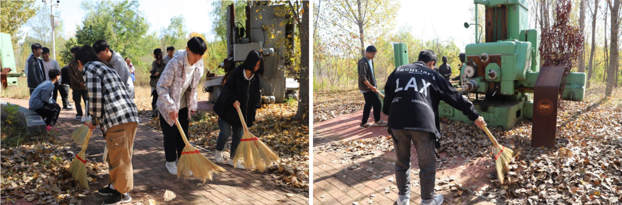 工业设备人性化设计的讨论,在现场对同学们进行了详细的讲授。教学现场气氛热烈,同学们认真听讲、仔细参观、积极提问。最后两个班的同学对塔山机械公园的步道、机床台面等周边环境的落叶、灰尘进行了全面清扫。