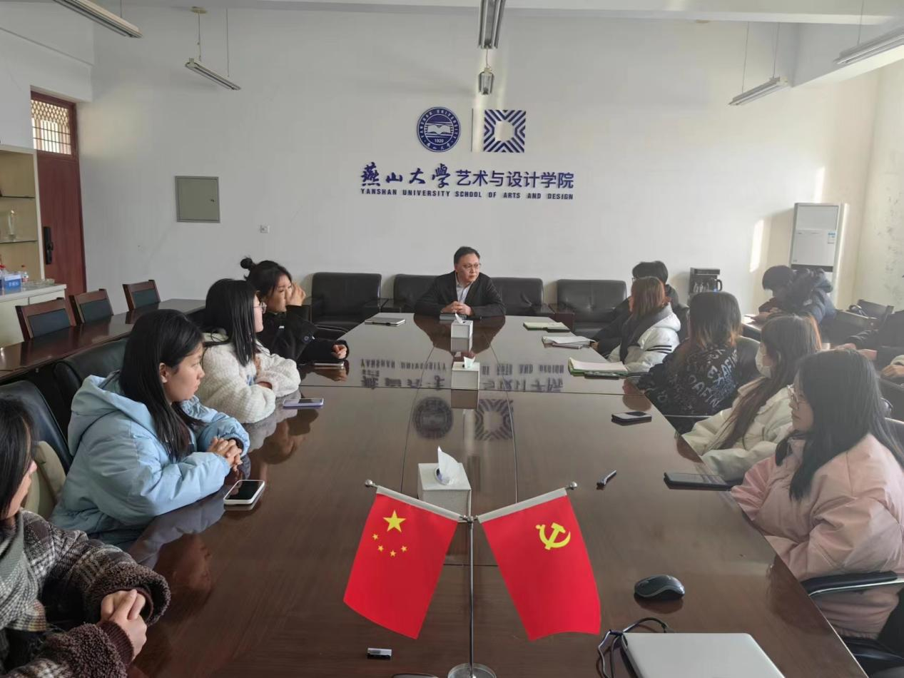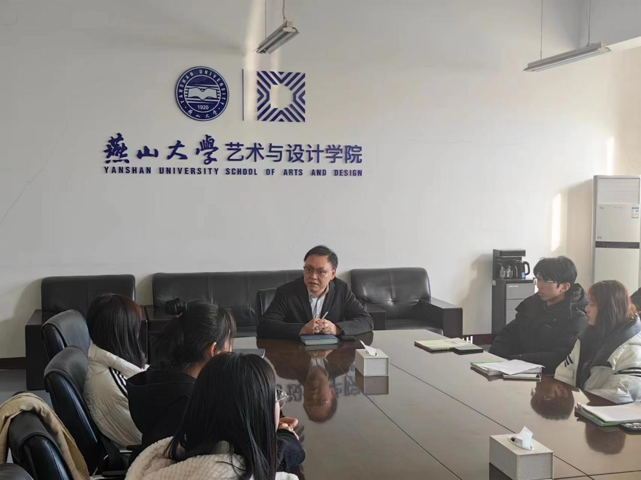 院长在美术馆C305会议室与联系班级同学交流座谈。辅导员卢文龙和2023级本科设计学类9班全体同学参加了活动。
