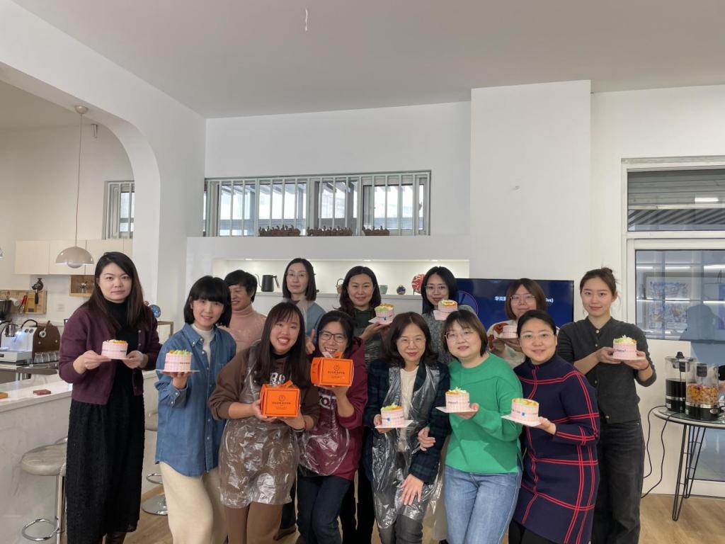 随后,为丰富女教职工的文化生活,展现新时代知识女性积极向上、奋发有为的精神风貌,邀请原麦时光西饼店甜品师开展甜品DIY活动。活动中,甜品师向老师们讲解相关制作步骤,大家兴趣十足,积极互动交流。在她们的耐心指导下,大家围绕着制作台有模有样地DIY起来,从做蛋糕前的准备到蛋糕胚的摆放、奶油的涂抹、水果搭配、装饰造型等,每一个环节大家都非常专心和细心,忙得不亦乐乎。一番忙碌之后,漂亮且富有特色的蛋糕纷纷亮相!大家欣赏着自己的劳动成果,脸上洋溢着幸福、快乐的笑容。