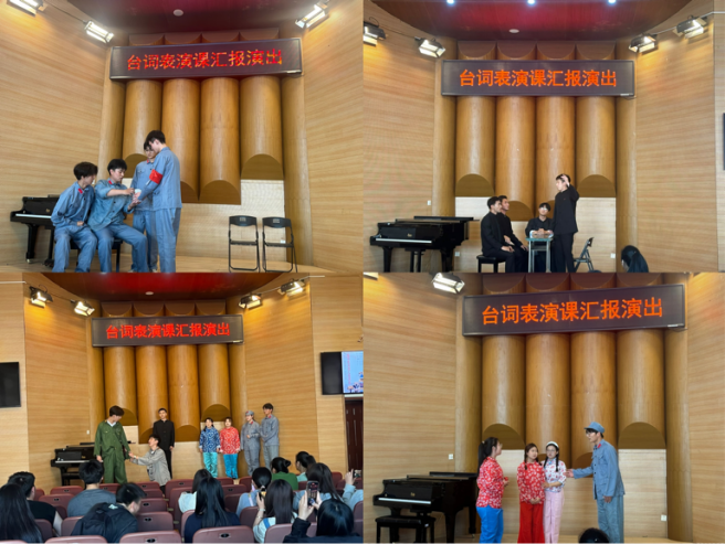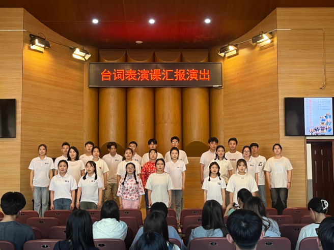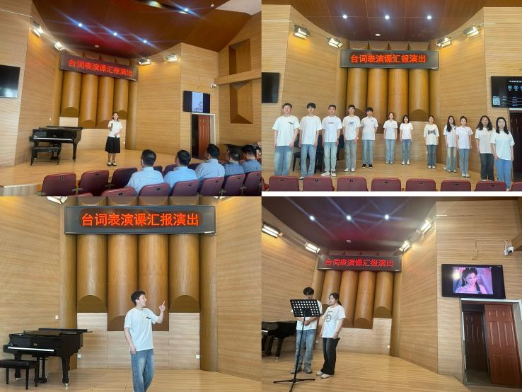 汇报演出以精彩的发声练习集锦拉开序幕,同学们将课上所学内容与动感节奏相结合,展现了气息与台词的和谐统一,声音明亮圆润、富有表现力。在诗词朗诵环节,同学们运用所学的语言表现力技巧,精准、生动地表达了文学作品中的情感世界。在分角色故事讲述环节,同学们用独特的音色和精湛的演技塑造了一个个鲜活、立体的角色形象。在配音展示环节,同学们用声音去演绎人物,将所学的台词表现技巧付诸实践,展现了配音的魅力和台词对人物形象塑造的重要性。
