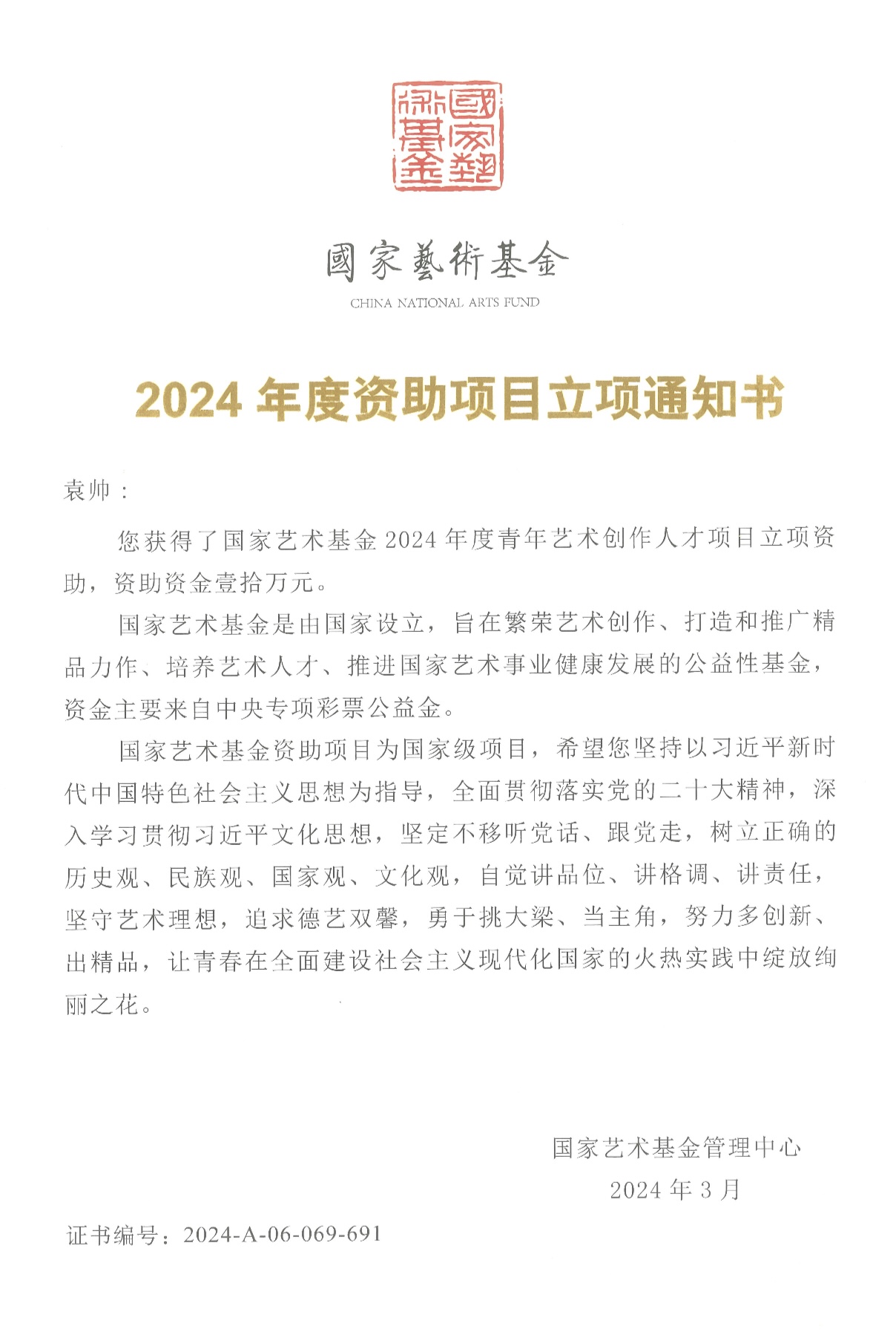 青年教师袁帅获得青年艺术创作人才器乐、声乐表演项目。