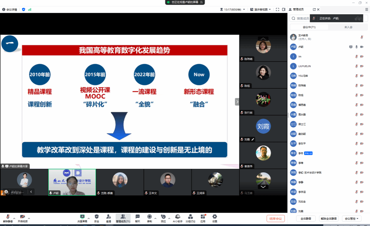工业设计系卢颖老师做《数字赋能 智慧创新》为主题的智慧课程专题培训。本次培训会由副院长王年文主持,学院全体教师参加了培训会议。
