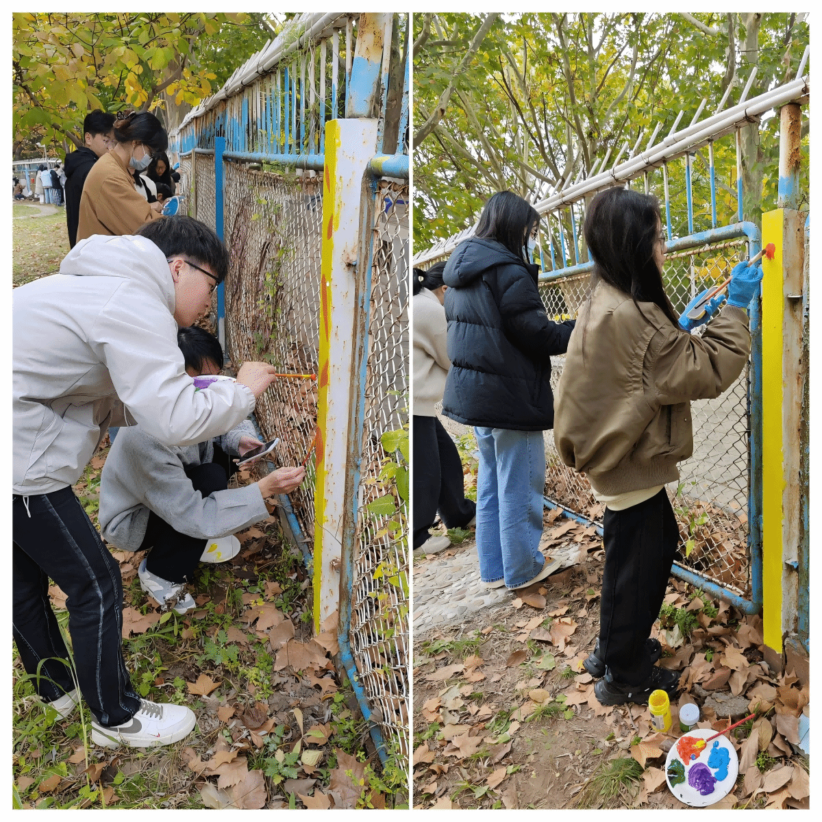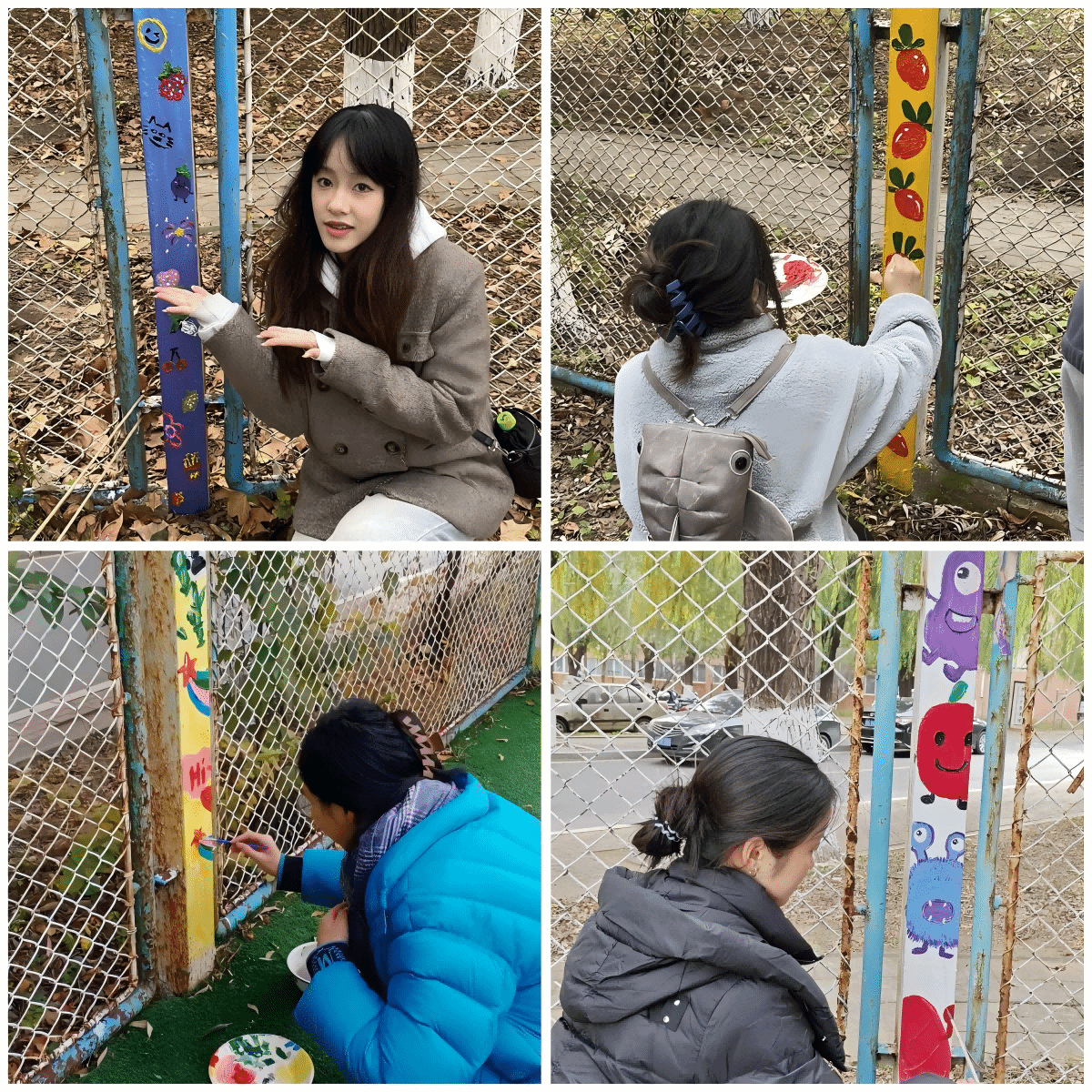 在工业设计系老师的指导下,同学们迅速分组,开始将精心构思的卡通画绘制到幼儿园的围墙上。他们运用多彩颜料,以细腻的笔触和丰富的色彩,将一个个生动有趣的卡通形象呈现在大家眼前。从调色、绘制到细节处理,每一步都凝聚着同学们的劳动与智慧。
