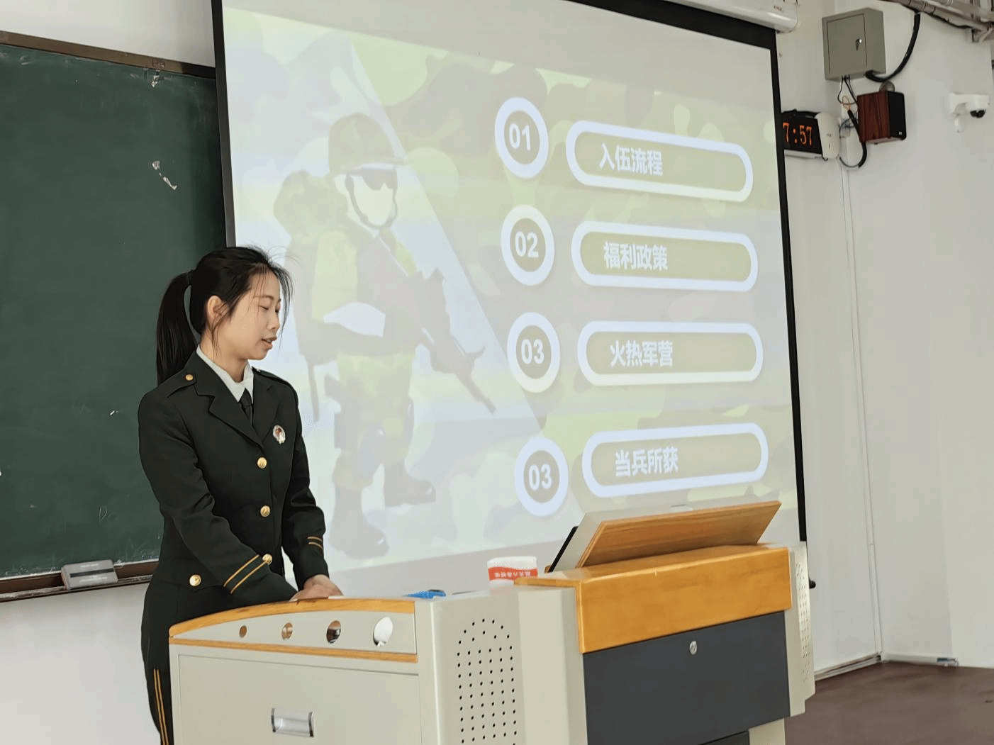 本次宣讲会邀请任佳蕊、韩斌、雷如香三位参军入伍复员返校的优秀大学生担任主讲人。他们结合自身军旅经历,生动讲述了军营生活的磨砺与成长。曾服役于火箭军某部的任佳蕊以“迷彩青春,不负韶华”为题,分享了“军营教会我责任与担当,更让我懂得青春的价值在于奉献”从学生到军人的蜕变历程。联勤保障部队退役大学生韩斌通过视频展示了保家卫国的震撼场景,激励同学们“用热血守护山河,用行动诠释信仰”。武警复员学生雷如香则以“坚守为国为民的使命”为切入点,讲述了在部队锤炼意志、突破自我的故事,并呼吁同学们“将艺术才华融入强军事业,让青春在军营绽放光彩”。