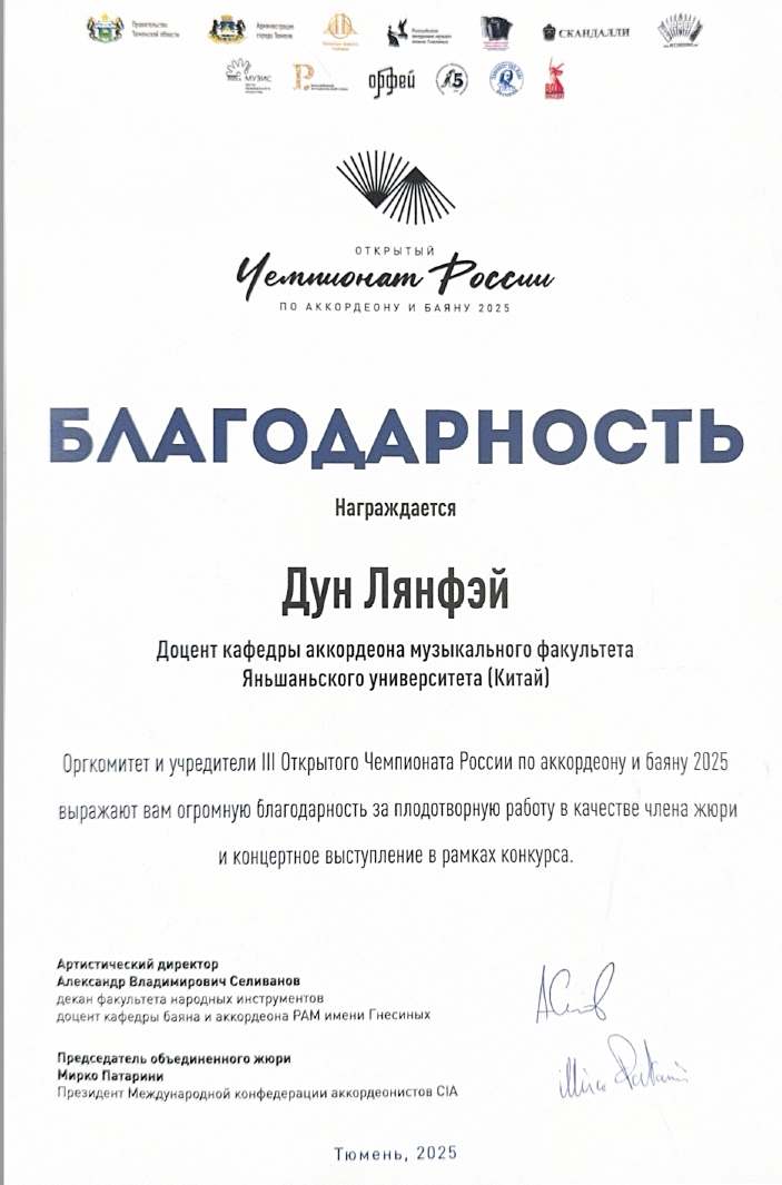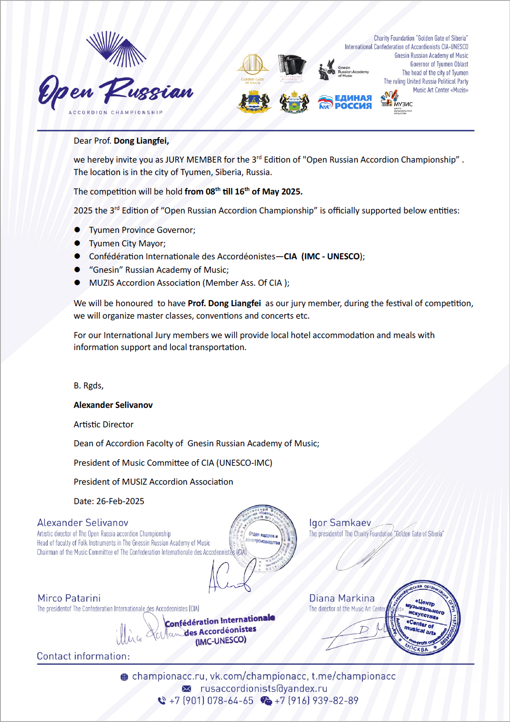 手风琴专业董梁飞老师受邀担任大赛评委。比赛邀请了来自俄罗斯、中国、塞尔维亚、白俄罗斯等国家的手风琴教育家、演奏家担任评委。来自世界各地音乐院校的500余名优秀选手参加各组别赛事。