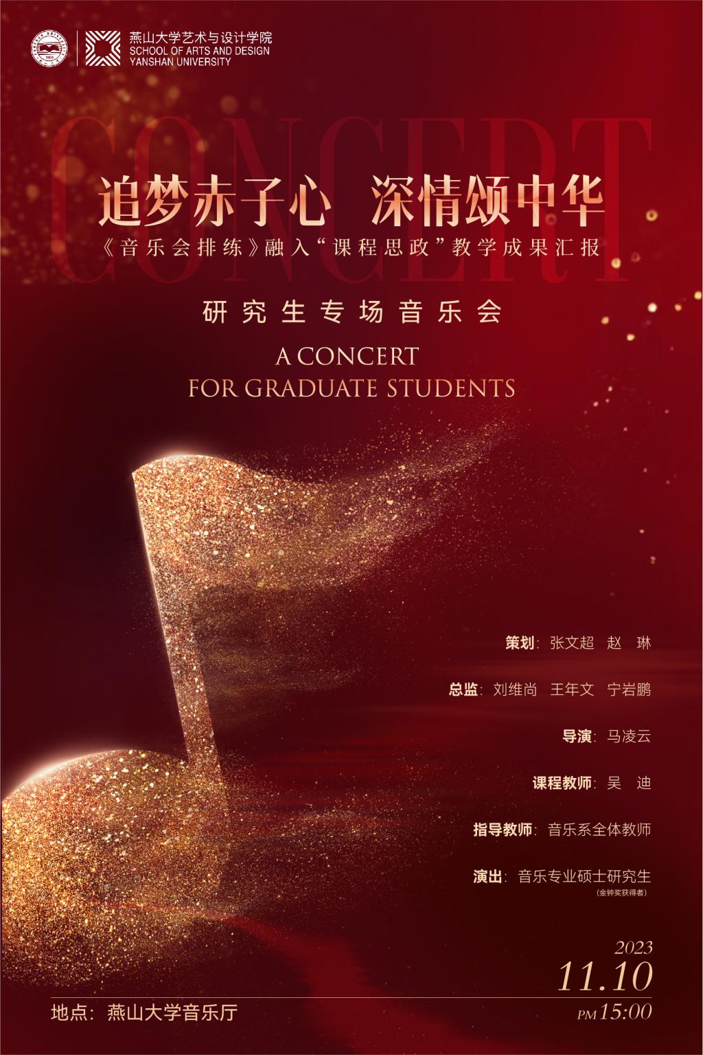 为推进课程思政建设,传承发扬优秀传统文化,推动国产无码 音乐专业学科发展,助力校园文化建设,国产无码 将于2023年11月10日15:00 ,举办“追梦赤子心,深情颂中华”2022级艺术硕士(音乐)专场音乐会。