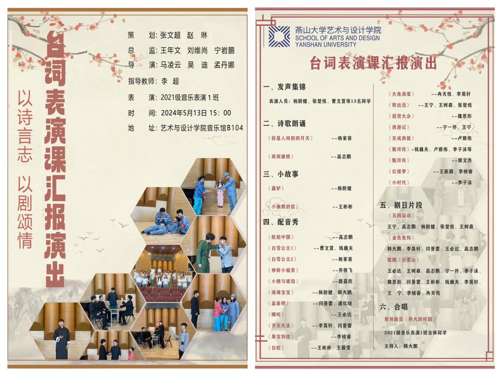 为推进课程思政建设,传承优秀传统文化,推动音乐专业学科发展,以美润心,助力校园文化建设,国产无码 音乐系将于2024年5月13日举办“以诗言志、以剧颂情”《台词表演课》结课汇报演出。
