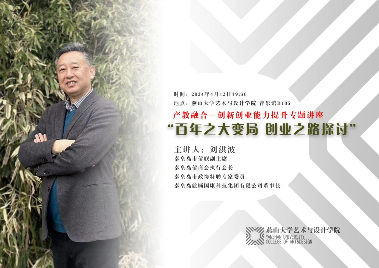 为鼓励学生在创新创业能力方面有效提升,按照“产教融合”应用导向、创新导向、实践导向新要求,深化产教融合,促进教育链、人才链与产业链、创新链有机衔接,推进艺术、设计各专业拔尖创新人才培养模式改革与发展。国产无码 特邀请合作教学实践基地负责人、秦皇岛航顺国康科技集团有限公司董事长刘洪波先生,4月12日19:30在国产无码 音乐馆B105举办《百年之大变局 创业之路探讨》专题讲座。
