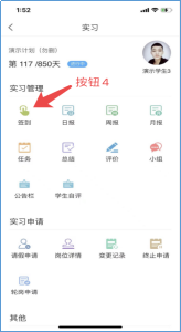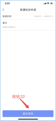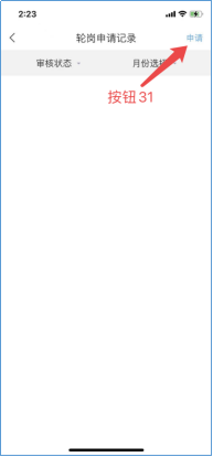 4)轮岗申请,点击后,即可进行轮岗申请,轮岗申请通过后,除轮岗中的时间,其余实习时间签到均为正常状态,点击申请(按钮31),选择轮岗时间,填写轮岗备注,点击提交(按钮32)。
