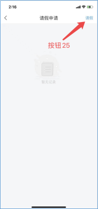 点击请假申请,即可看到请假申请的记录。点击请假(按钮25),进入编辑页面,填写请假类型,时间,图片,事由,然后点击提交(按钮26)。