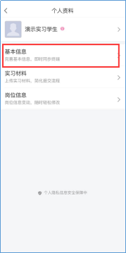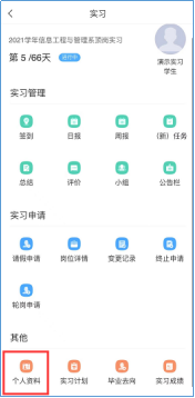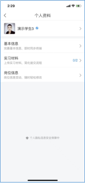 1)个人资料,点击后即可看到基本信息、实习材料、岗位信息填写完成之后点击提交。