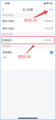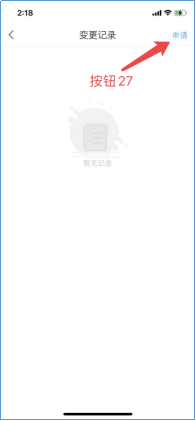 3)变更申请,点击后,即可查看变更申请记录。点击申请(按钮27),选择变更岗位(按钮28),填写变更理由后点击提交(按钮29)。