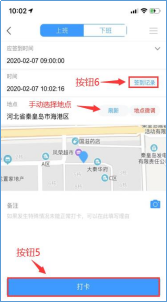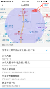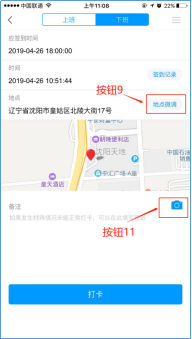 点击地点微调(按钮9),可以微调打卡地点,选择合适的地点,点击确定(按钮10)。点击照相(按钮11),可加入打卡图片。