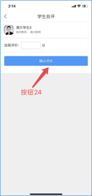 点击学生自评(按钮23)即可进行自我成绩评价(按钮24),评价后可自行撤销重新评价,根据后台管理员设置的成绩权重占比得出最终该模块成绩。
