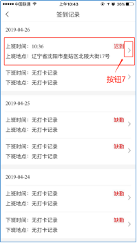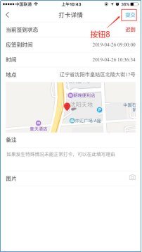 点击签到(按钮4),可以上下班打卡(按钮5)。点击签到记录(按钮6),可以看到每一天的签到详细记录。任意打开一条签到记录(按钮7),可以看到当天的打卡详情,如果发生特殊情况未能正常打卡,可以在备注里填写理由,也可以添加图片,然后点击提交(按钮8)。