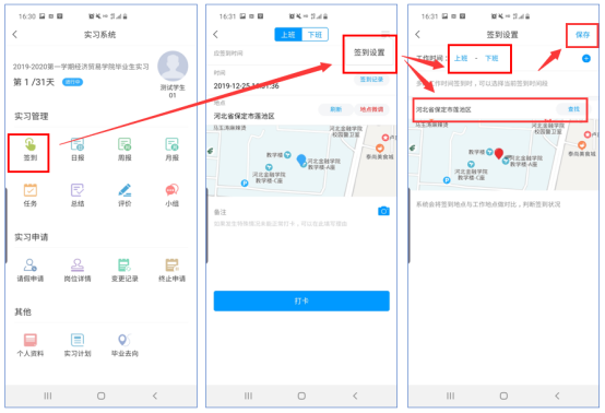 自主申请实习通过后,显示以下界面。学生需要自己设置实习地点和上下班时间,要求:学生必须在到达实习单位后,才可以进行设置,设置一次即可。设置流程如图(岗位申请的学生无需这一步骤)。