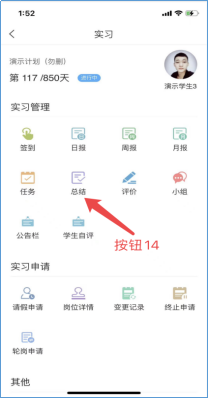 4)总结。点击总结(按钮14)即可查看上传总结,注意:实习总结期未到不能上传总结。