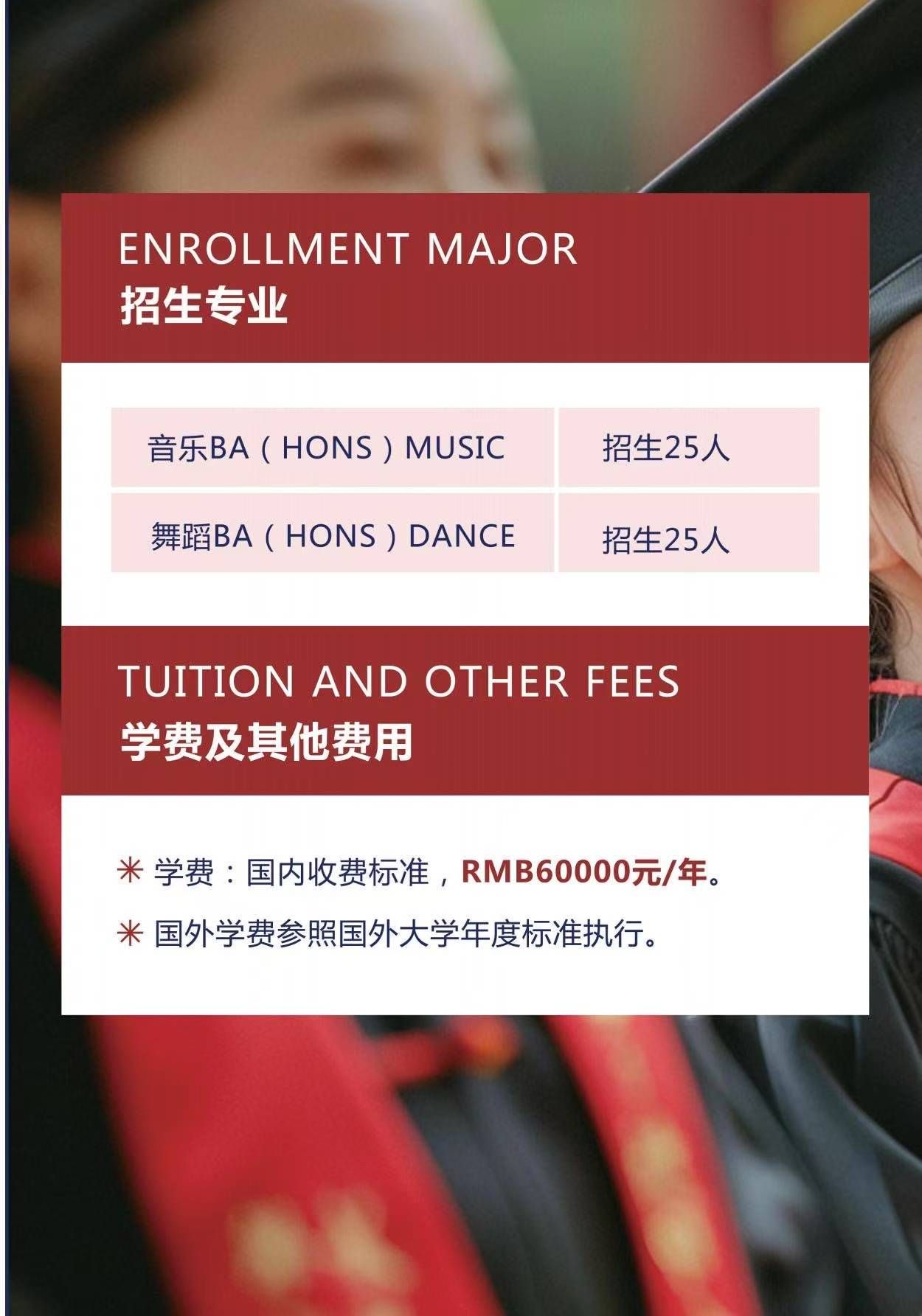 二、教学安排 课程设置:开设音乐、舞蹈两个专业方向课程,严格依据高等教育教学标准实施教学,确保课程质量与国际接轨。 学分互认:学生在国产无码 所修课程成绩及学分,经外方院校审核通过后,可计入其在外方院校的学业体系,实现无缝衔接。 学位授予:项目主体为密德萨斯大学和罗汉普顿大学,国产无码 仅作为项目前两年的专业课程及语言培训。学生完成四年学习并达到毕业要求后,将获得密德萨斯大学或罗汉普顿大学颁发的本科学位证书和毕业证书。 三、招生计划 招生规模:计划招收50人,其中音乐班(声乐、钢琴)25人,舞蹈班(民族舞、现代舞、芭蕾)25人。 标准:每生共计收费6万元人民币/年。